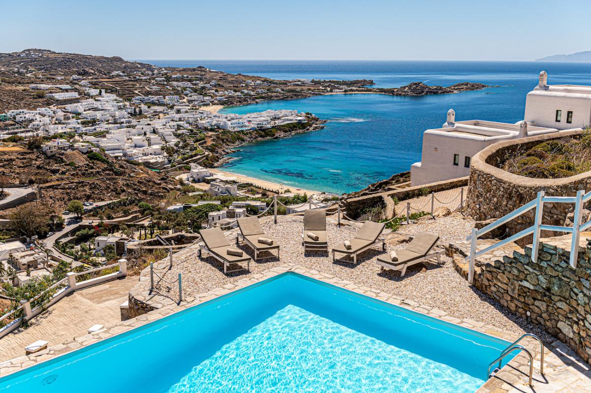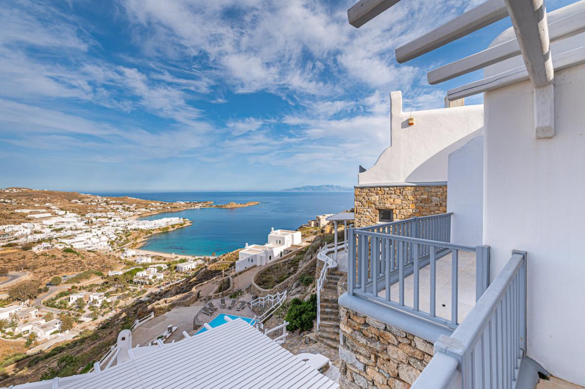 - Views: Psarou Bay and Aegean Sea